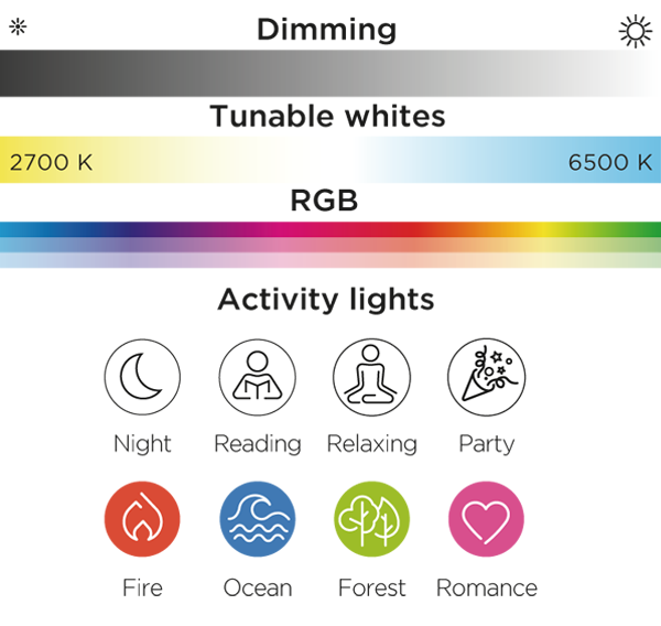 A 2-in-1 remote control that allows you to switch the power off from the top half by pointing to change the intensity of the light, the color changing temperature. and access the colors or even multiple varied scenes. From its lower part, you can turn a group of lamps on or off from anywhere in the house.