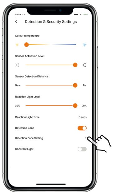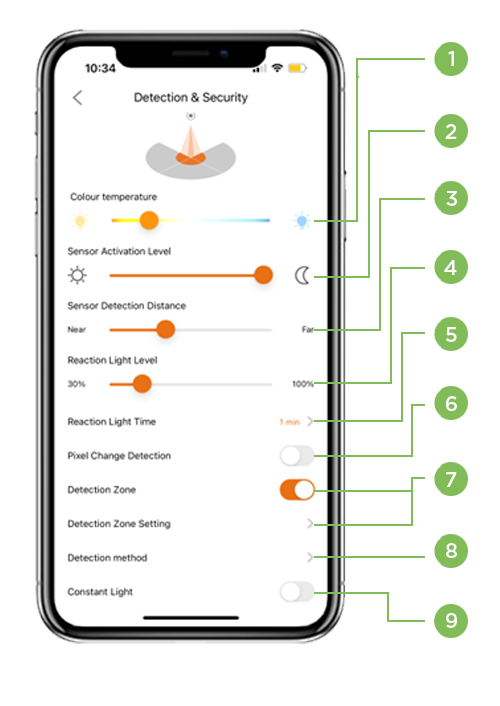 9 – Switching on constant light will cause the light to activate at the lux level set above (Sensor Activation Level) for the set time and at the set brightness
