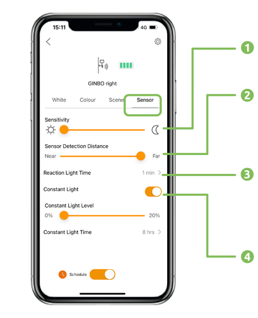 4 – Switching on constant light will cause the light to activate at the lux level set above (Sensor Activation Level) for the set time and at the set brightness.